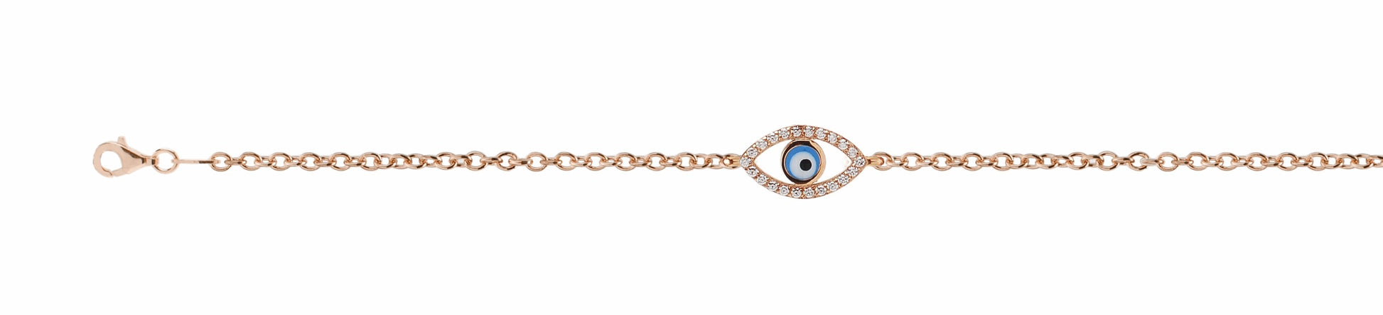- Design Unico: Catena rolò in finitura rosé , gold e silver con un charm a forma d’occhio aperto in un mix di delicate tonalità e luminose zirconie bianche.