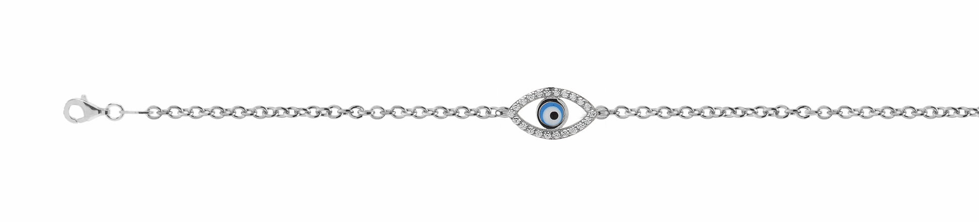 - Design Unico: Catena rolò in finitura rosé , gold e silver con un charm a forma d’occhio aperto in un mix di delicate tonalità e luminose zirconie bianche.